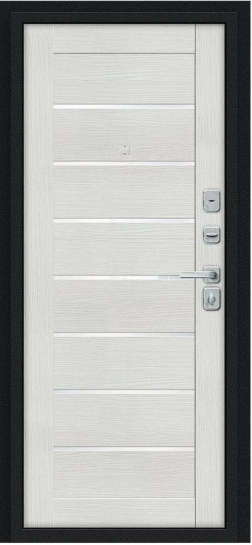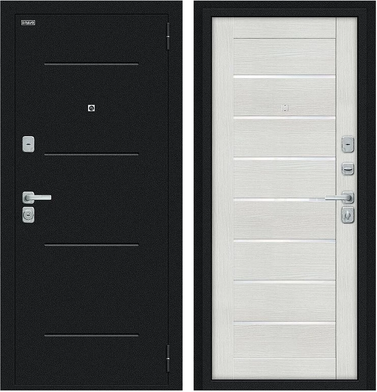 Надежная входная Дверь Браво Техно/BChrome Букле черное/Bianco Melinga премиум класса по цене 34 423 руб. Большая толщина стали защитит от проникновения в ваш дом, квартиру или коттедж. Используется очень качественная фурнитура: замки, цилиндры, ручки, защелки. Покрытие и отделка двери изготовлено под внимательным контролем производителя. Дверь имеет долгий срок службы и гарантию.