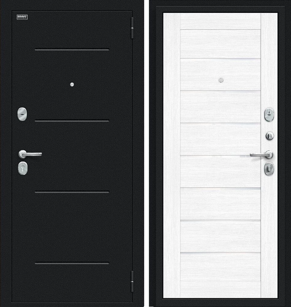 Надежная входная Дверь Браво Техно Букле черное/Snow Melinga премиум класса по цене 30 773 руб. Большая толщина стали защитит от проникновения в ваш дом, квартиру или коттедж. Используется очень качественная фурнитура: замки, цилиндры, ручки, защелки. Покрытие и отделка двери изготовлено под внимательным контролем производителя. Дверь имеет долгий срок службы и гарантию.